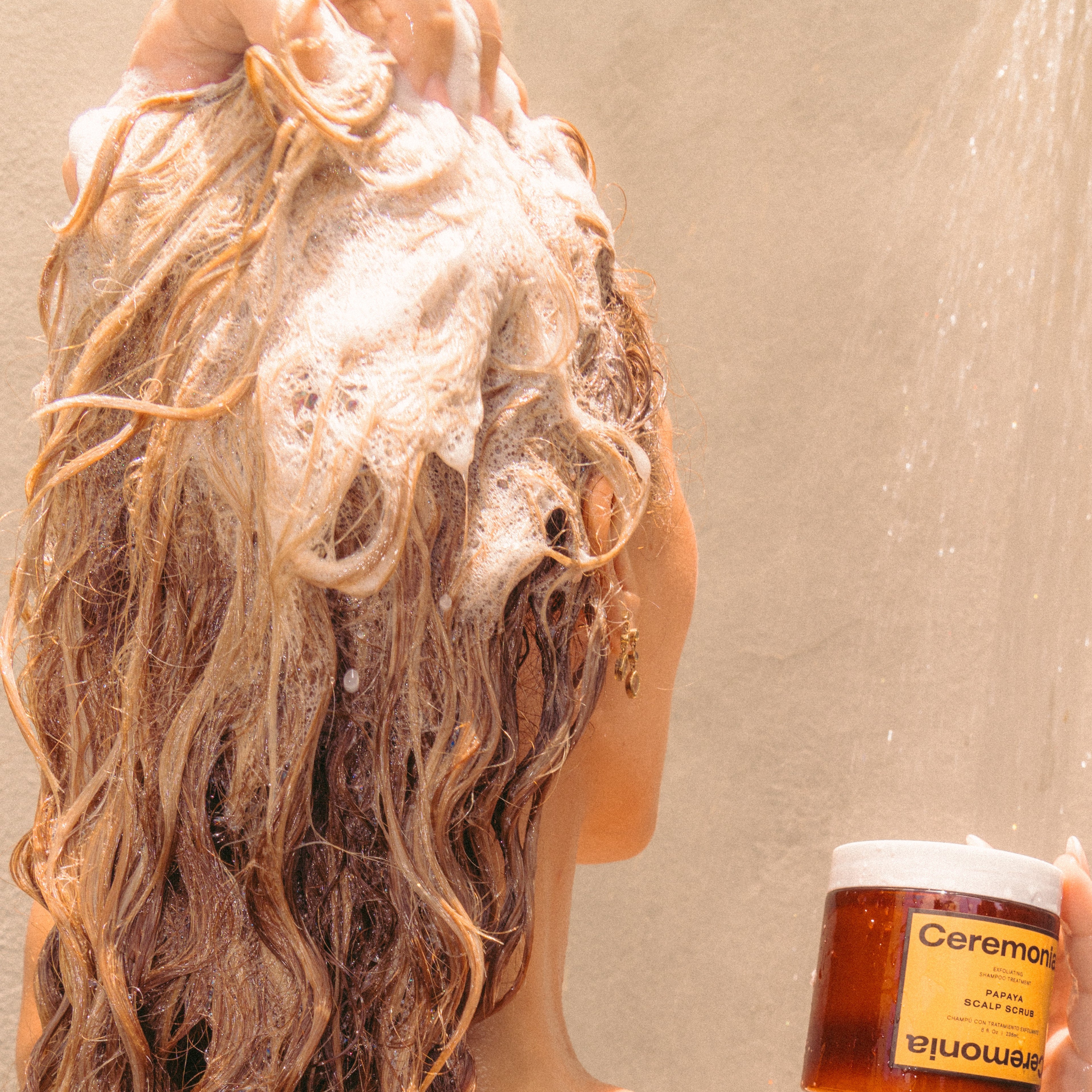 The Papaya Scalp Scrub is an invigorating, whipped shampoo featuring Papaya Enzymes and Pink Salt to exfoliate the scalp, help balance the scalp’s oil, revitalize hair and get rid of impurities or buildup. The scrub works harmoniously to support its scalp’s microbiome natural defense mechanisms. This is particularly significant in countering Staphylococcus aureus, a common trigger for eczema and psoriasis. Guava Leaf and Prickly Pear Cactus extracts help infuse the scalp with the moisture it needs, while overall invigorating for ultimate hair wellness. Your scalp and hair’s essential detox, without the harsh ingredients.